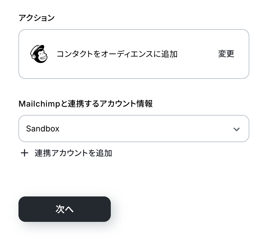 Mailchimpと連携するアカウント情報に問題がなければ、「次へ」をクリックします。