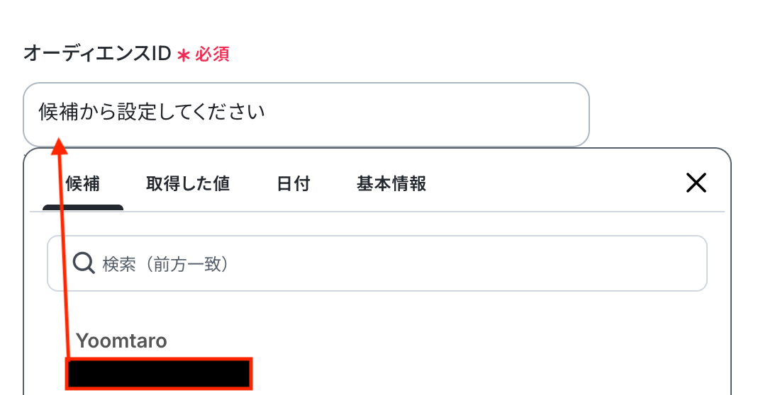 入力欄をクリックすると連携が有効になっているアカウントから候補が表示されるので、対象の項目を選択しましょう。