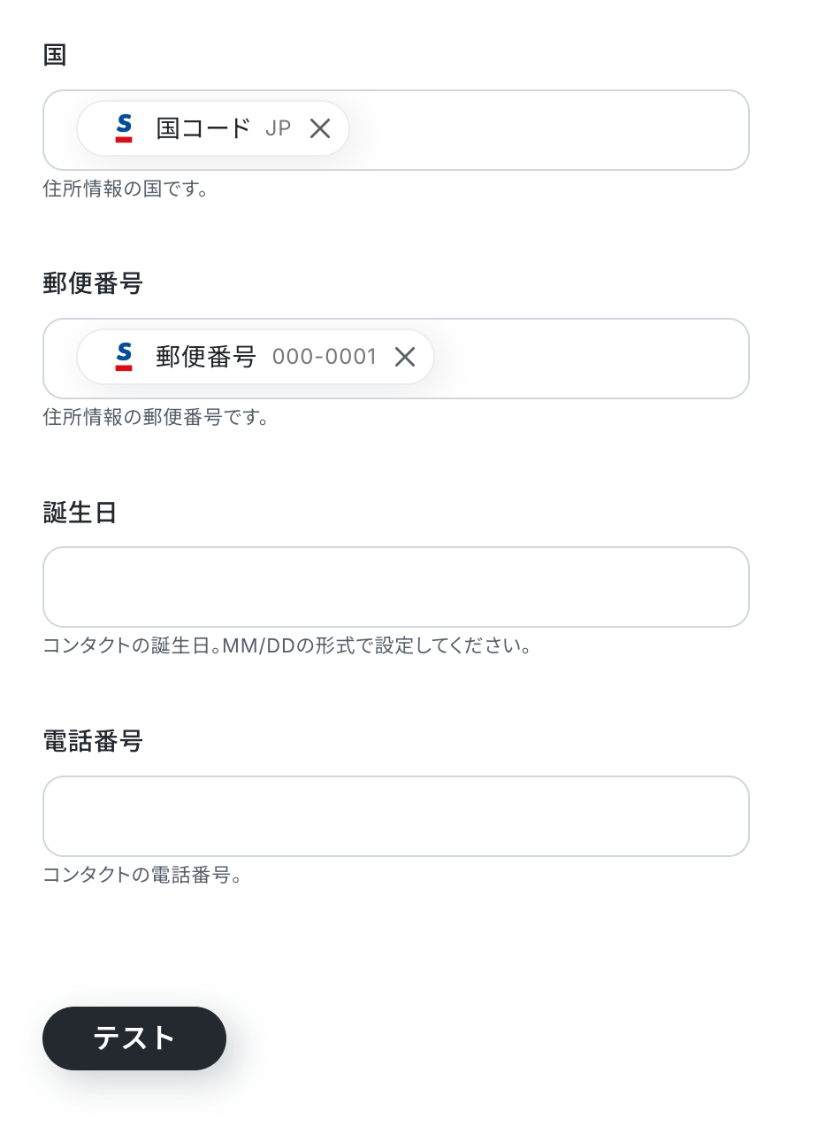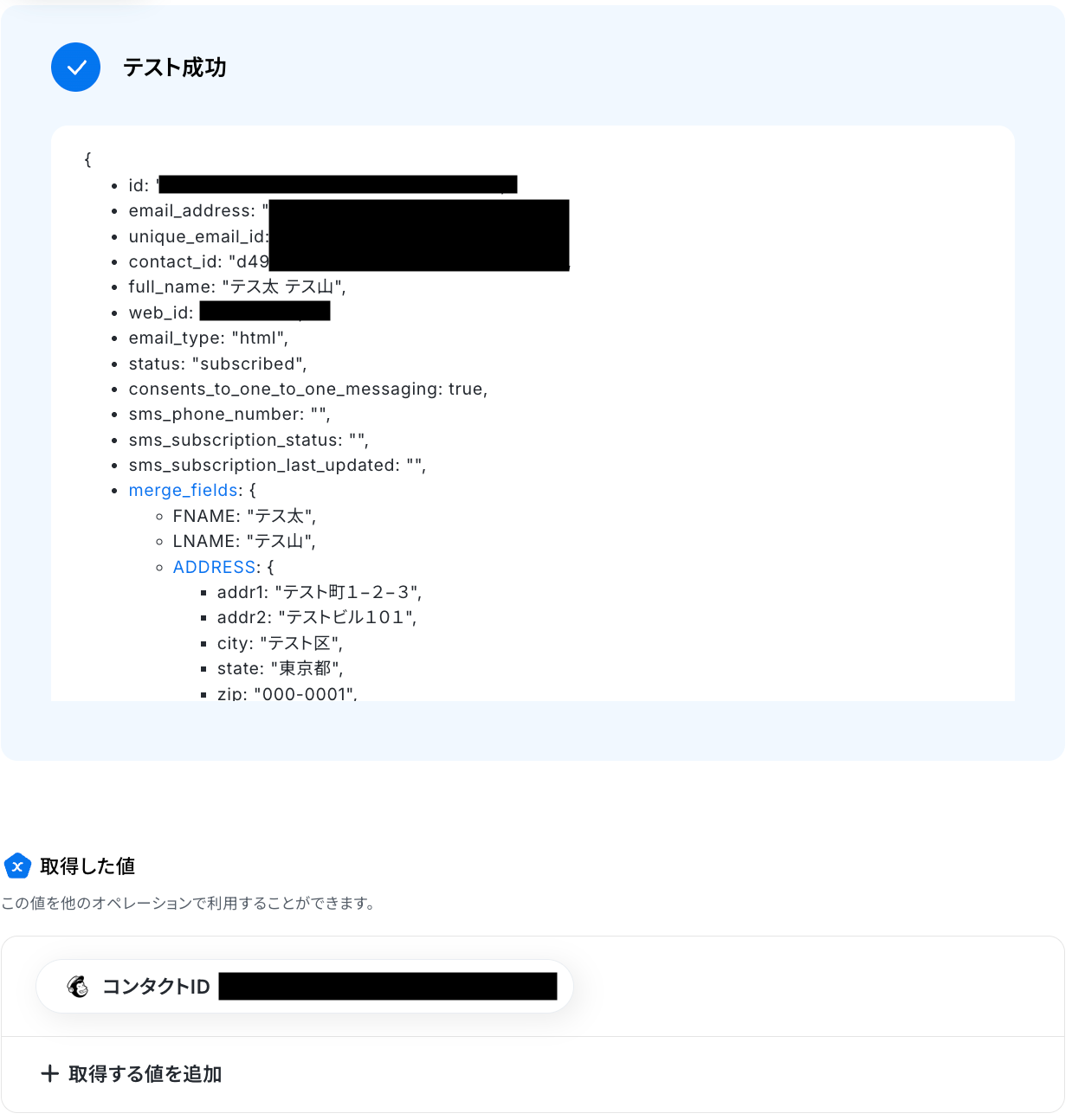 なお、テキストを直接入力した部分は固定値とされるため、取得した値を活用せず設定を行うと毎回同じデータがMailchimpに登録されてしまうので注意が必要です。