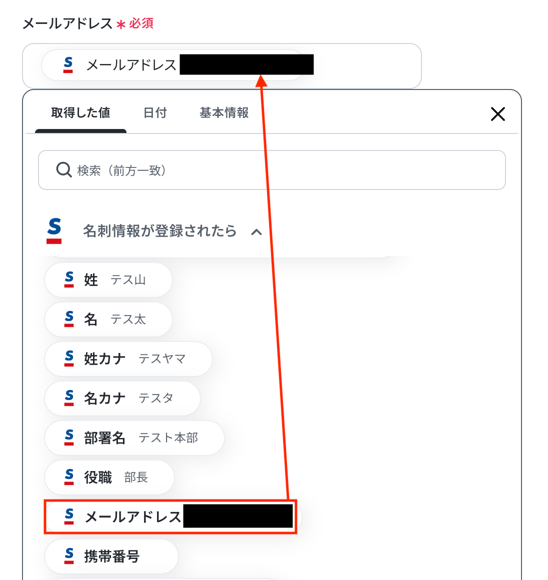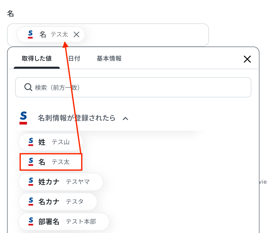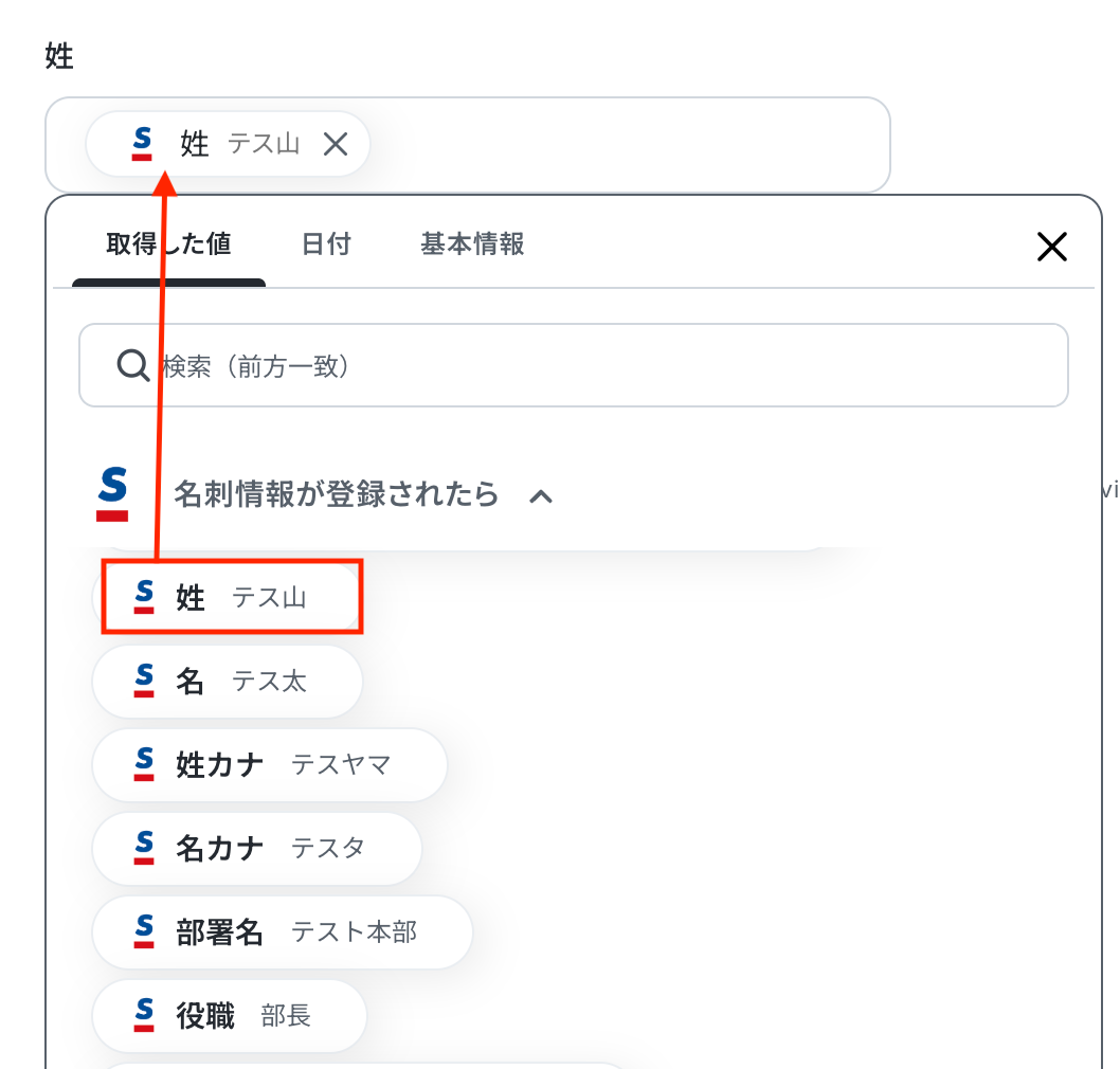 入力欄をクリックすると、前のステップでSansanから取得した値が表示されるので、選択して入力しましょう。