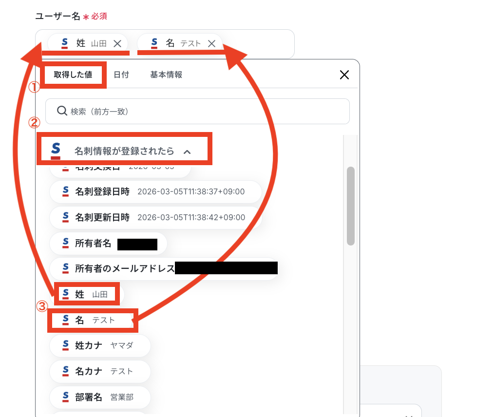 【取得した値を埋め込む方法】 ①入力欄をクリックして「取得した値」を表示 ②「名刺情報が登録されたら」をクリック ③「姓」「名」を選択