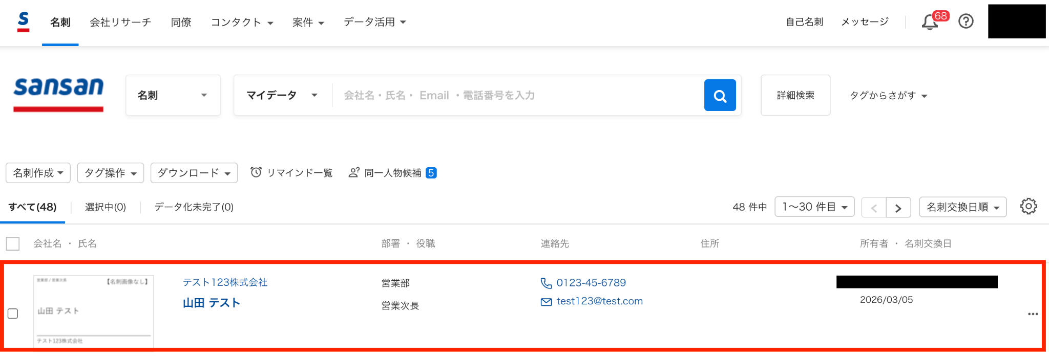 まずはテスト用にSansanで名刺情報を登録します。