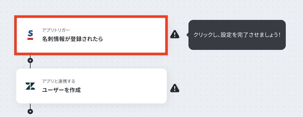 はじめに、SansanとZendeskをYoomと連携します。 次に、トリガーでSansanを選択し、「名刺情報が登録されたら」というアクションを設定します。 最後に、オペレーションでZendeskを選択し、「ユーザーを作成」アクションを設定します。この設定により、トリガーで取得した名刺情報をもとにZendeskにユーザーが作成されます。 ※「トリガー」:フロー起動のきっかけとなるアクション、「オペレーション」:トリガー起動後、フロー内で処理を行うアクション■このワークフローのカスタムポイント