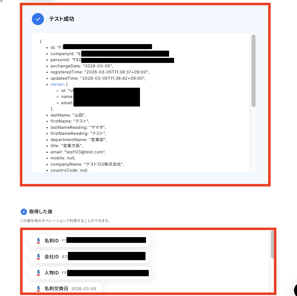 設定が完了したら「テスト」をクリックします。 テストに成功すると、Sansanのデータが「取得した値(※)」の欄に反映されるので、確認できたら「完了」をクリックしてください。 ※取得した値 とは? トリガーやオペレーション設定時に「テスト」を実行して取得した値のことです。 後続のオペレーション設定時の値として利用でき、フローボットを起動する度に変動した値となります。