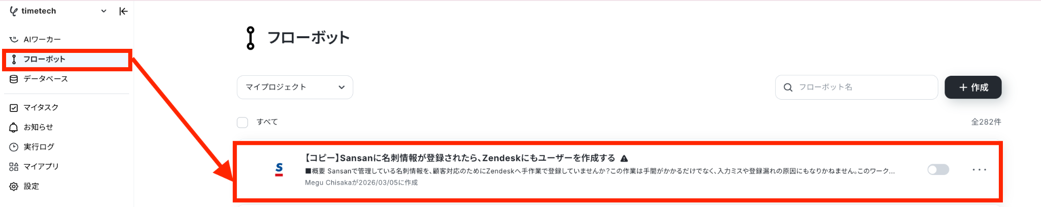 フローの作成方法 今回は「Sansanに名刺情報が登録されたら、Zendeskにもユーザーを作成する」 フローを作成していきます!