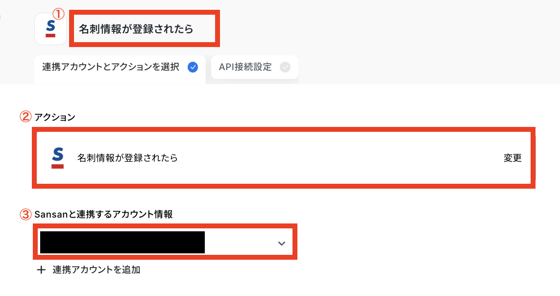 ②アクション:デフォルトで「名刺情報が登録されたら」が選択されているのでそのままで問題ありません! ③Sansanと連携するアカウント情報:ステップ1で連携したアカウントが表示されていることを確認しましょう。