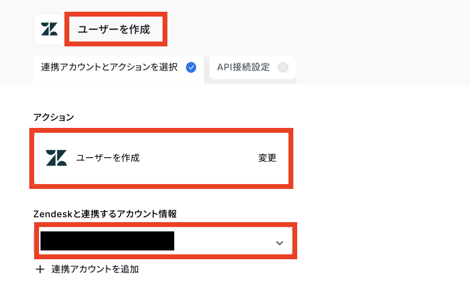ステップ4:Zendeskのアクション設定 「ユーザーを作成」をクリックします。