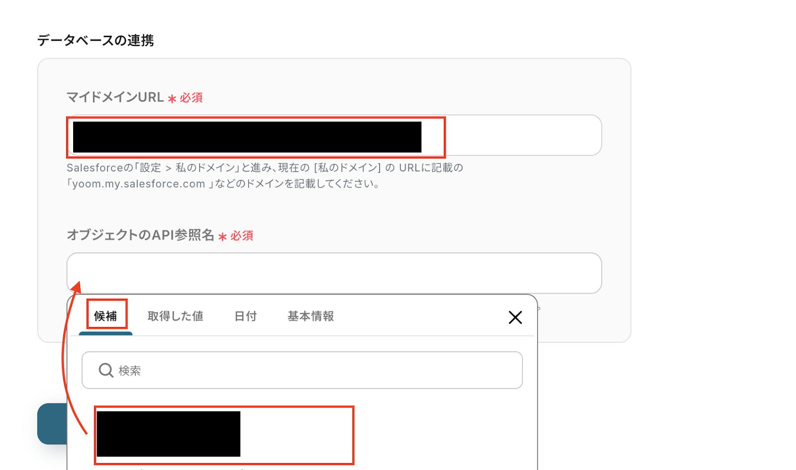 マイドメインURLは注釈を確認し、オブジェクトのAPI参照名は候補から選択してください。