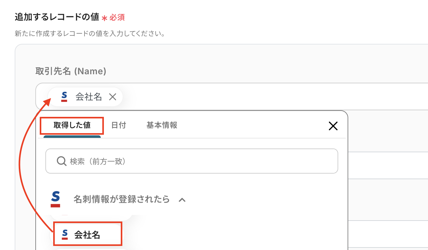 Salesforceのレコード情報が表示されたら、各項目にSansanの取得した値から選択していきましょう。