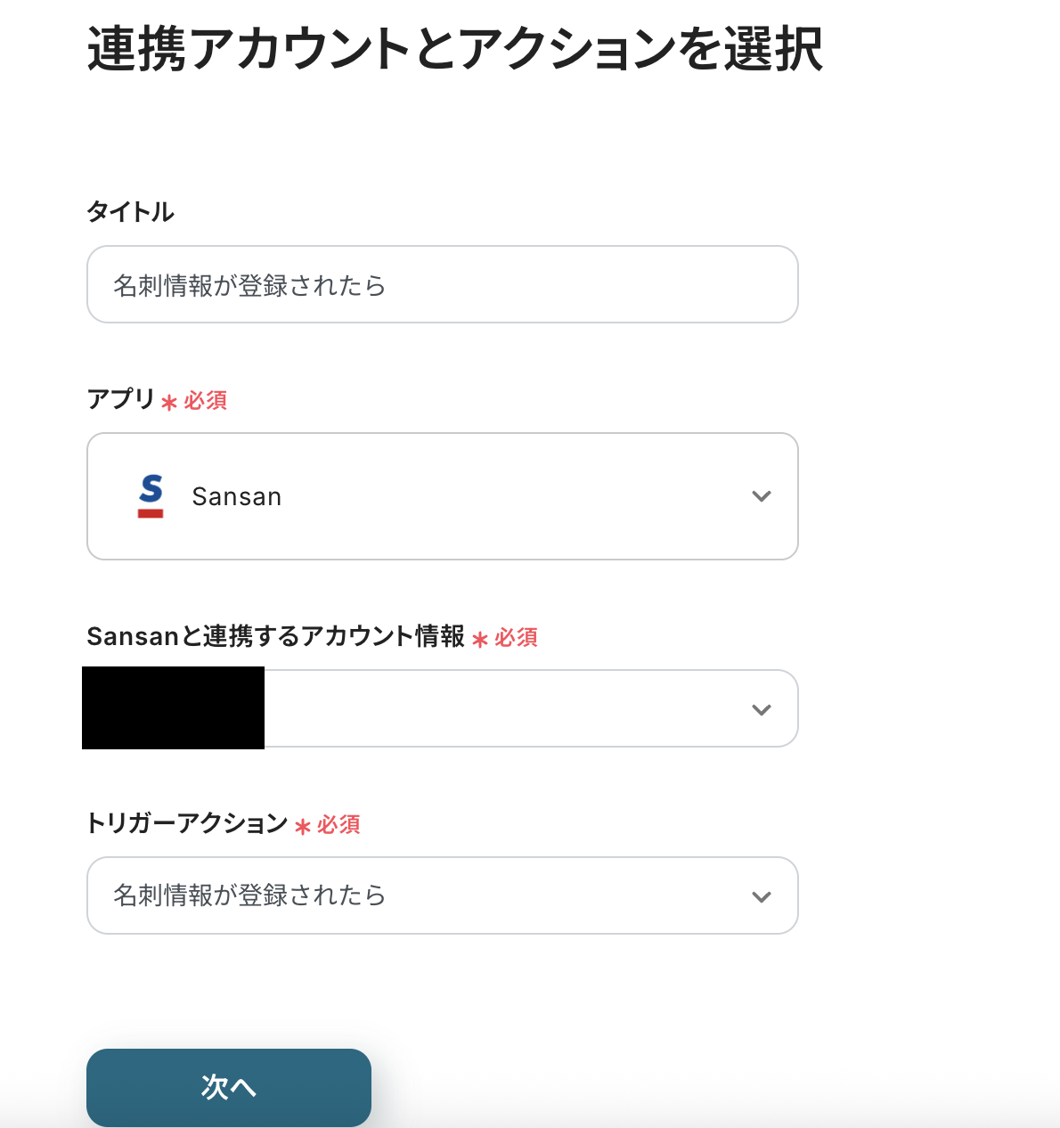 Sansanの設定と同様に、タイトルやアカウント情報を確認して「次へ」をクリックします。