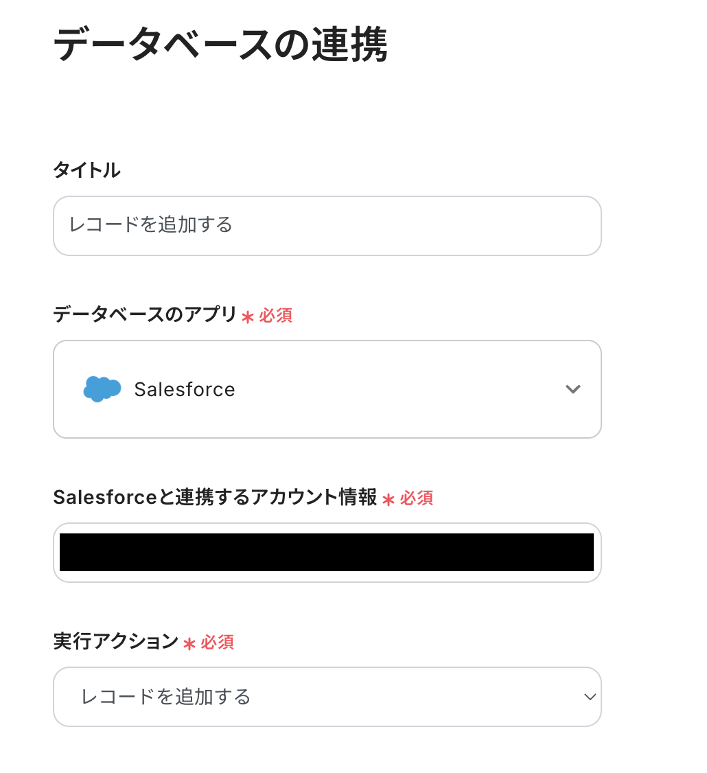 Salesforceにレコードを追加するステップで、「追加するレコードの値」にカスタム項目が表示されます。