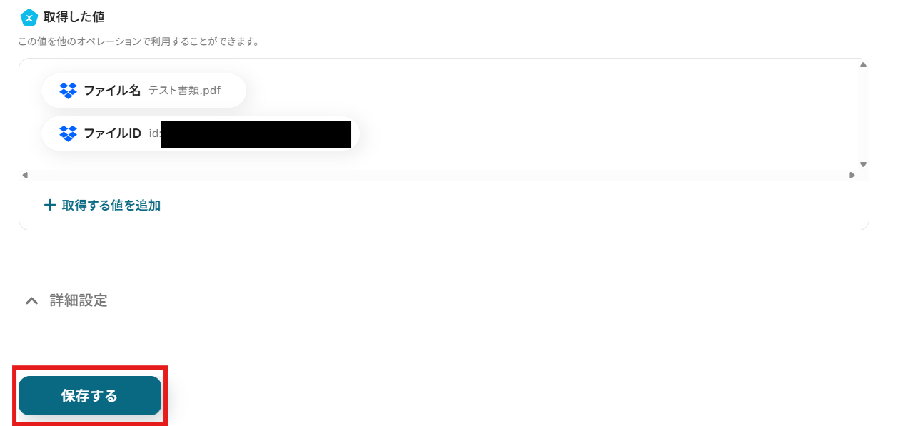 設定できたら「テスト」を行いましょう。 テストに成功すると「取得した値」に反映されます。 「保存する」を選択しましょう。