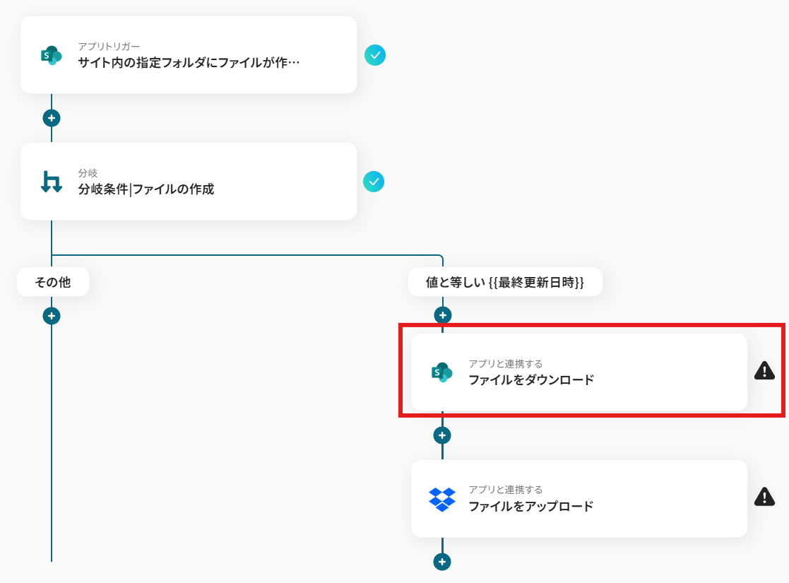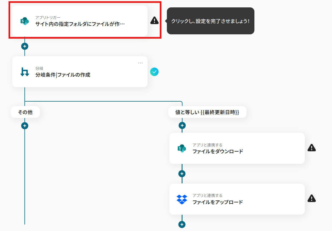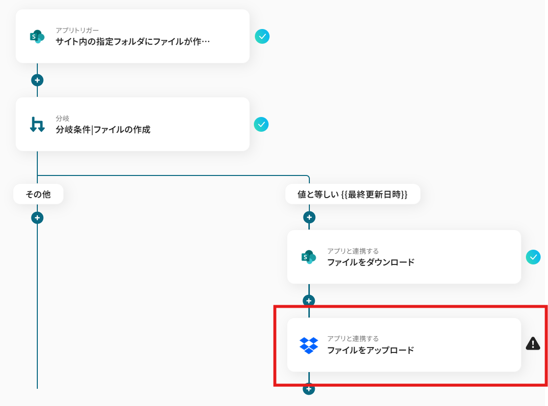 Dropboxの指定フォルダにファイルが作成されたことをトリガーに、そのファイルを自動でMicrosoft SharePointの指定フォルダにも格納します。