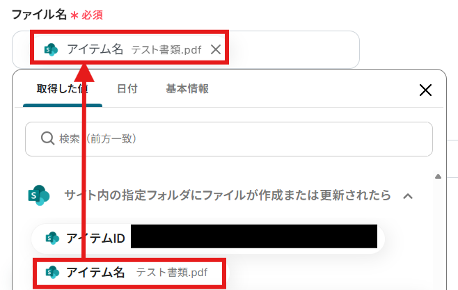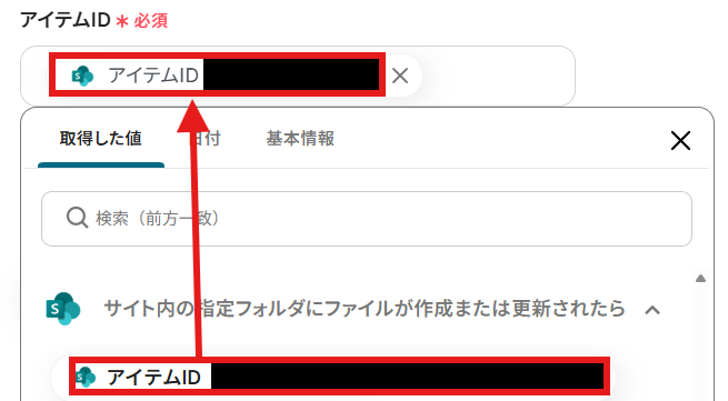 「アイテムID」を「取得した値」から設定しましょう。 「取得した値」は変数となるので、Microsoft SharePointでサイト内の指定フォルダにファイルが作成される度にそのデータを活用可能になります!