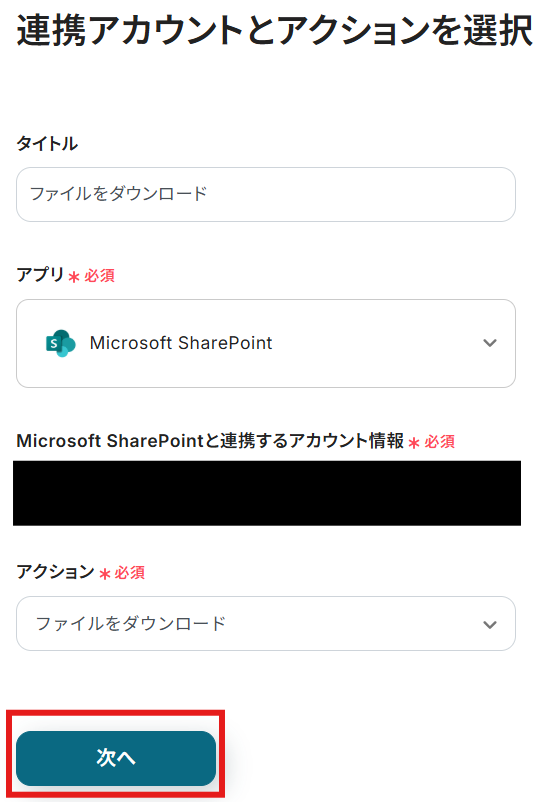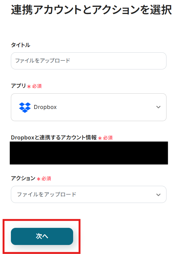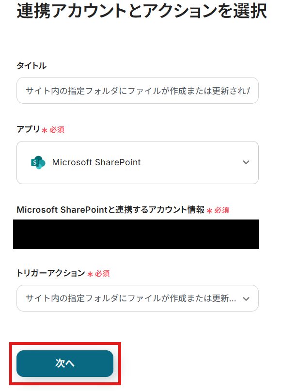 タイトルと連携するアカウント情報を確認し、アクションはテンプレート通りのまま「次へ」をクリックして進んでください。