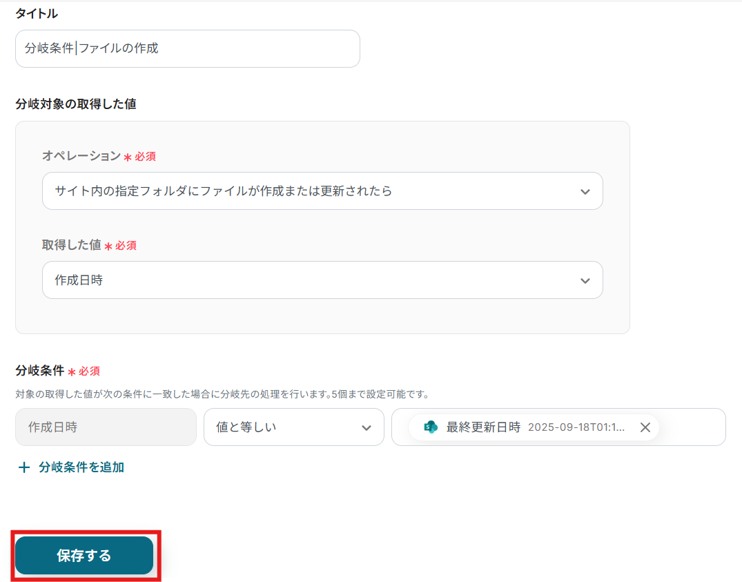 「分岐条件を指定」はデフォルトで設定されています。 「タイトル」は任意で変更可能です。 「分岐対象の取得した値」と「分岐条件」が以下の画像と同じように設定されているか確認してみてくださいね。今回はMicrosoft SharePointでファイルが新規作成されたときにフローボットが起動するようにしたいので、「作成日時」と「更新日時」が等しいことが「分岐条件」に設定されています。