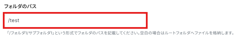 「フォルダのパス」を注釈に沿って設定しましょう。 例としてDropboxの「test」というフォルダにファイルをアップロードしたいので、「/test」と設定しました!