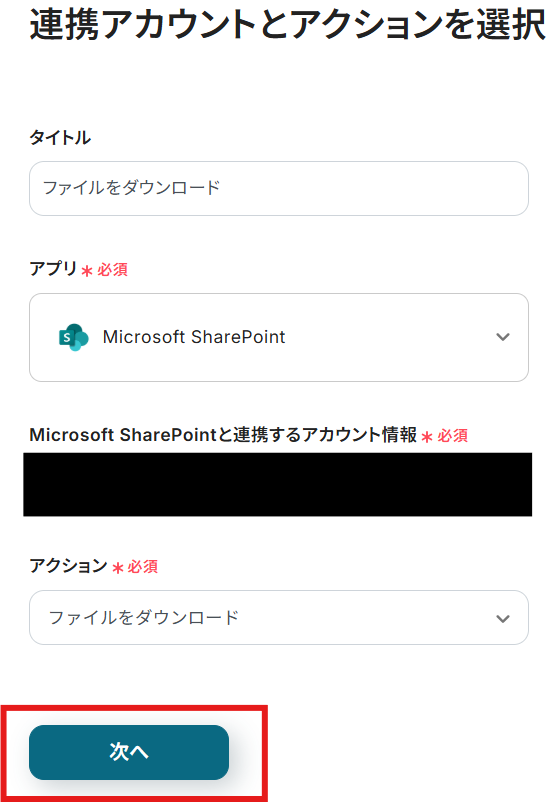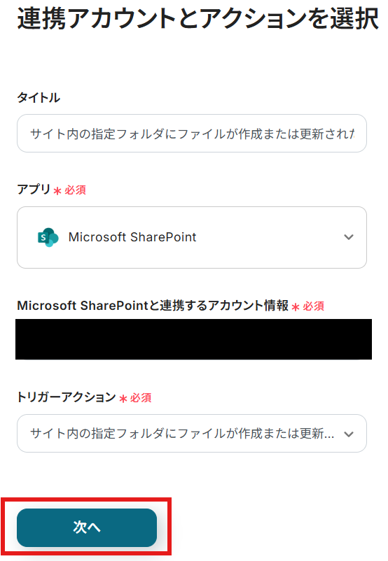 タイトルと連携するアカウント情報を確認し、アクションはテンプレート通りのまま「次へ」をクリックして進んでください。