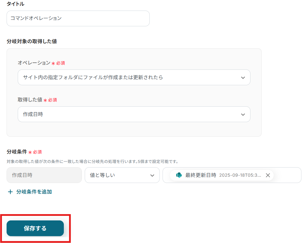 今回はMicrosoft SharePointでファイルが作成されたときにフローボットが起動するようにしたいので、「分岐条件」が「作成日時」と「最終更新日時」が等しいときに設定されています。