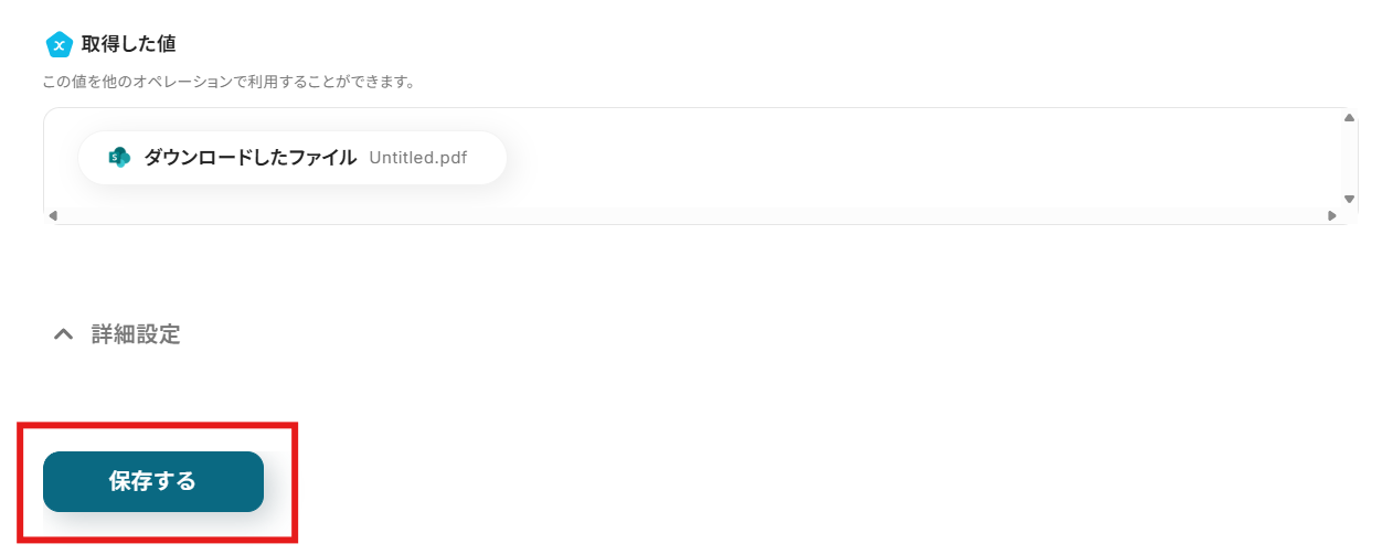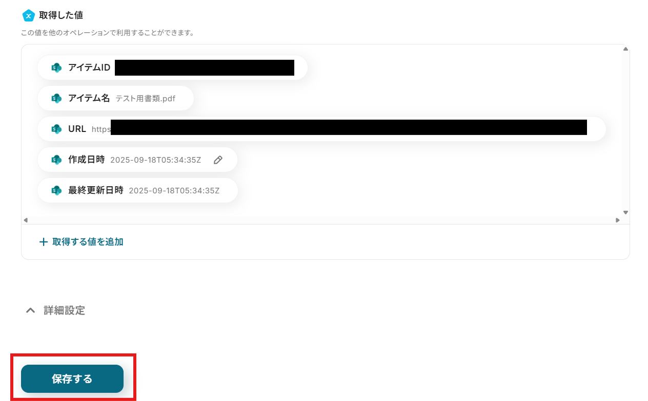 「取得した値」は変数となるので、Microsoft SharePointでサイト内の指定フォルダにファイルが作成される度にそのデータを活用可能になります!