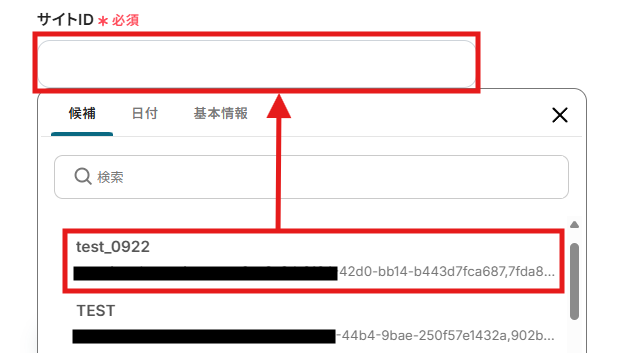 「サイトID」と「フォルダID」を候補から選択しましょう。