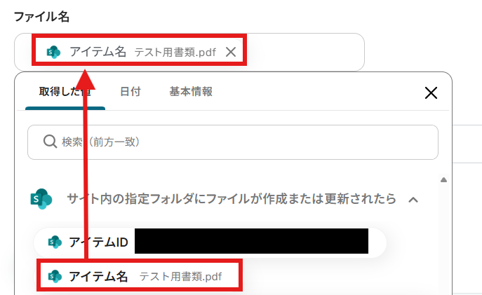 「ファイル名」を「取得した値」から設定しましょう。