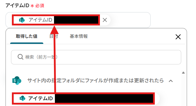 「アイテムID」を「取得した値」から設定しましょう。