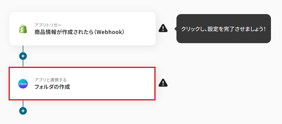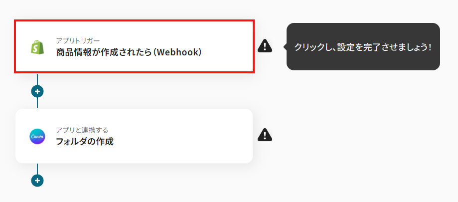 はじめに、ShopifyとCanvaをYoomと連携します。 次に、トリガーでShopifyを選択し、「商品情報が作成されたら(Webhook)」というアクションを設定し、フローボットが起動するきっかけを作ります。 その後、オペレーションで分岐機能を設定し、特定の条件に合致した場合にのみ後続の処理が実行されるようにします。 最後に、オペレーションでCanvaの「フォルダの作成」アクションを設定し、Shopifyの商品情報をもとにしたフォルダを自動で作成します。 ※「トリガー」:フロー起動のきっかけとなるアクション、「オペレーション」:トリガー起動後、フロー内で処理を行うアクション
