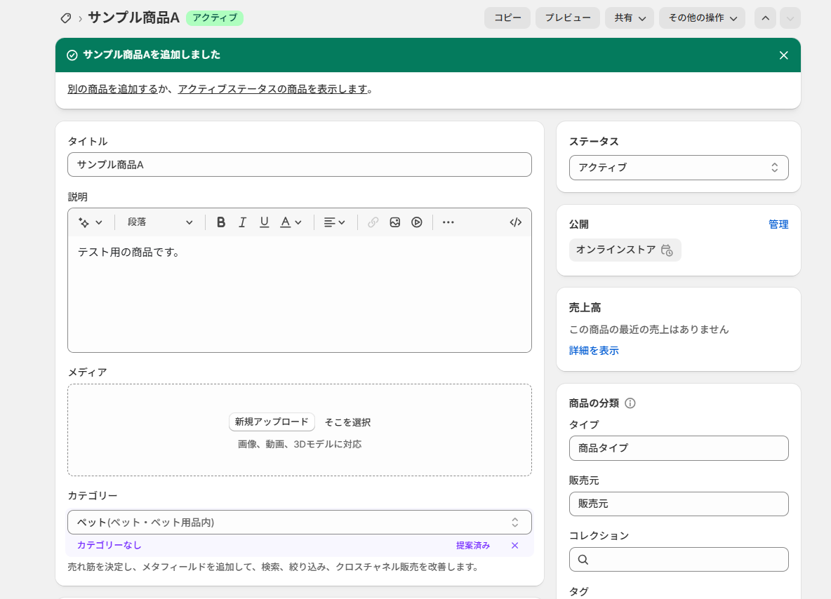 今回は下図のような商品情報を作成してみました。 テスト用のため、商品情報内容は架空の情報(「株式会社test」や「テスト太郎」など)でOKです!