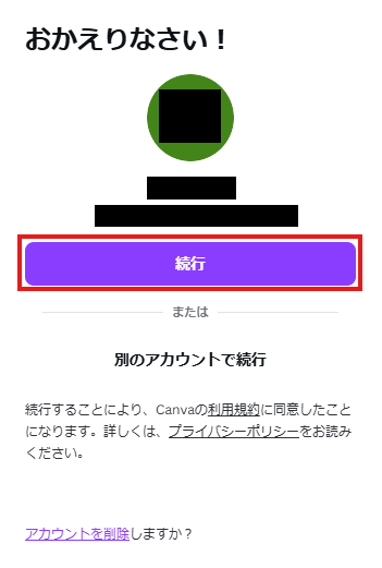 4.画面に、アカウントが表示されたら「続行」をクリックしましょう。