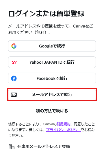 1.「新規登録」をクリックした後、右上の検索窓に「Canva」と入力し、検索結果からCanvaのアイコンを選択します。 表示された画面で、任意のログイン方法を選択しましょう。 今回は、「メールアドレスで続行」をクリックしました。