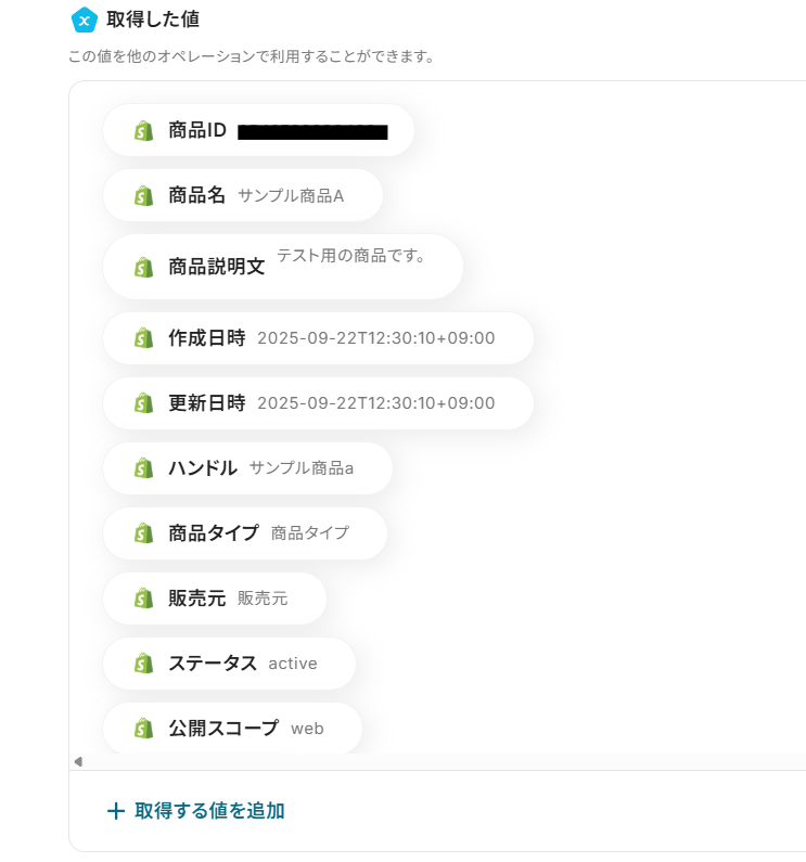 ※取得した値とは? トリガーやオペレーション設定時に、「テスト」を実行して取得した値です。 取得した値は、後続のオペレーション設定時の値としてご利用いただくことができ、フローボットを起動する度に、変動した値となります。 ※詳しくは、こちら をご参照ください。