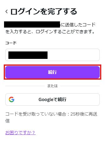 3.次の画面で、登録しているメールアドレスに送信されたコードを入力して、「続行」をクリックしてください。