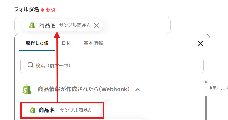 Canvaでフォルダを作成する際、フォルダ名を自由に設定できます。 例えば、トリガーとなったShopifyで作成された商品の「商品名」や「商品ID」などの情報を変数として利用し、「(商品名)_販促デザイン」といった形式で自動的に命名することが可能です。 ■注意事項
