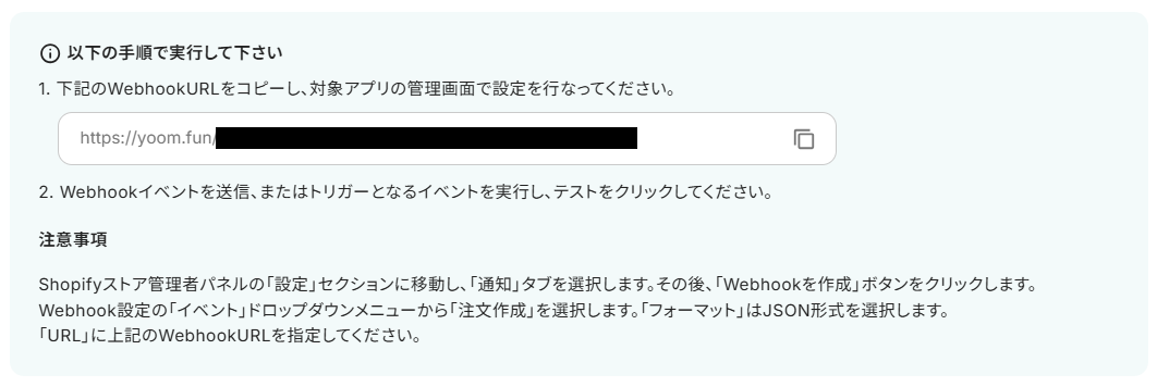 URLをコピーしたら、Shopifyの画面で設定を行います。「注意事項」に沿って設定しましょう。
