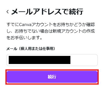 2.次の画面で、メールアドレスを入力し、「続行」をクリックしてください。