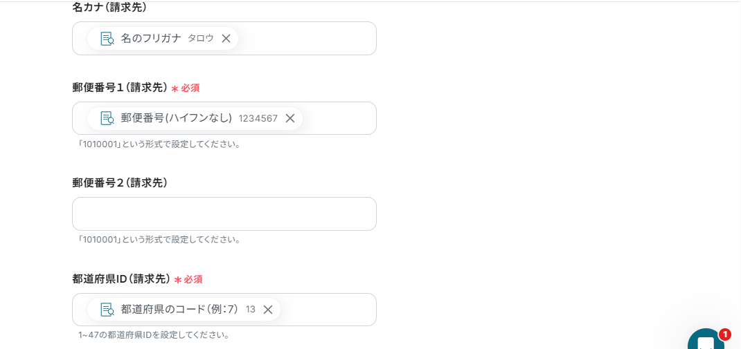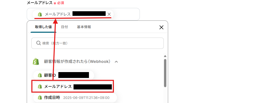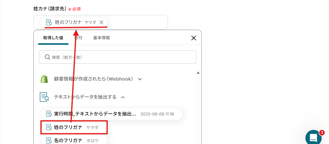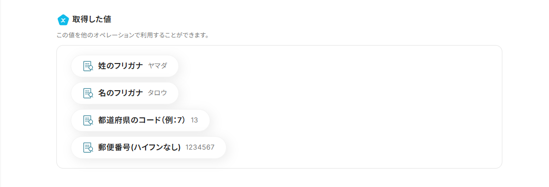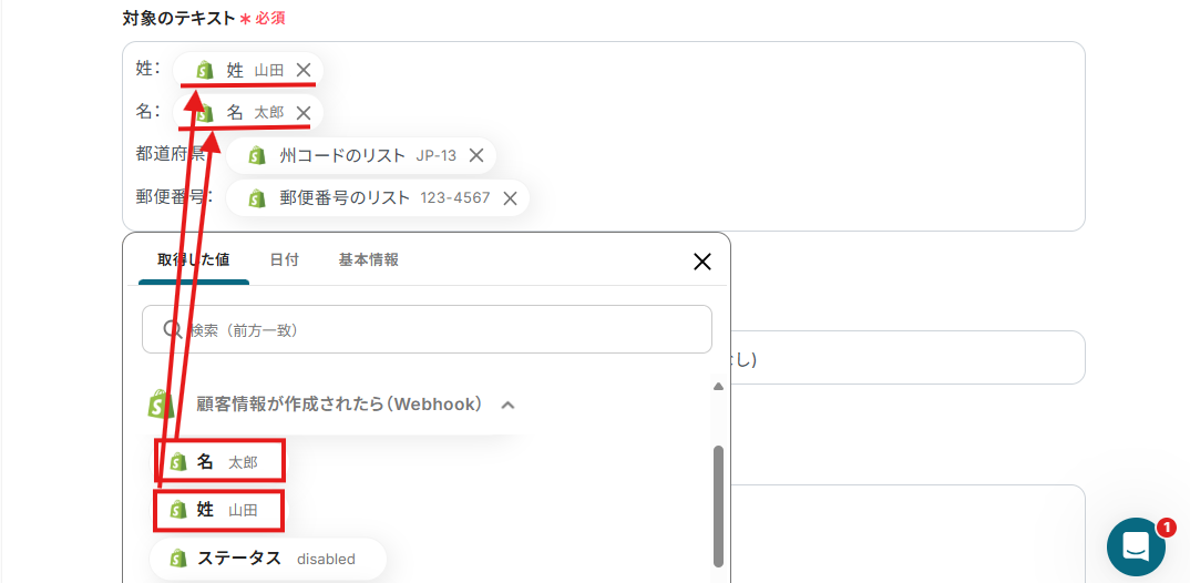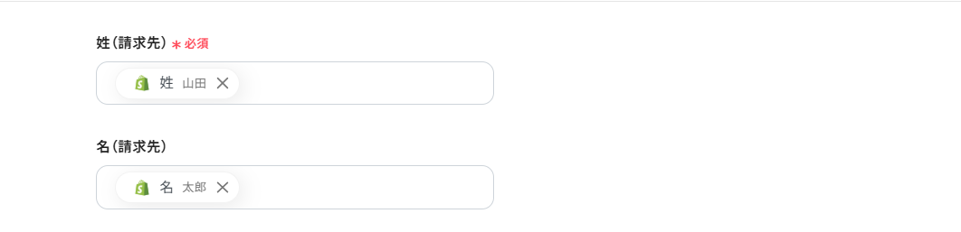 今回は一例として、Shopifyの新規顧客情報から「姓」「名」「都道府県」「郵便番号」を自動で取得できるように設定しています。