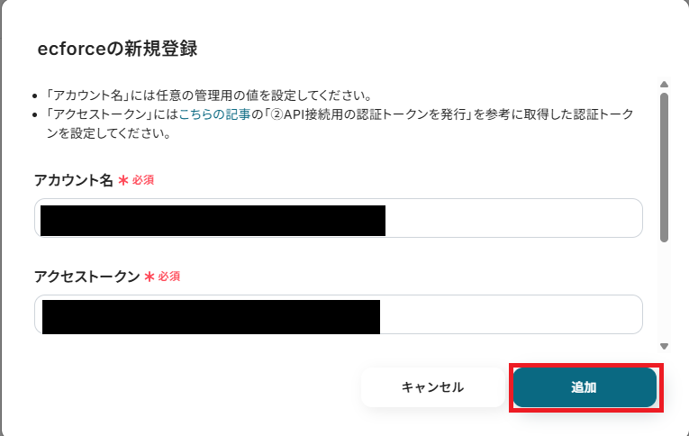 下記画面が表示されたら、必須項目を入力し「追加」ボタンを押したら連携完了です。