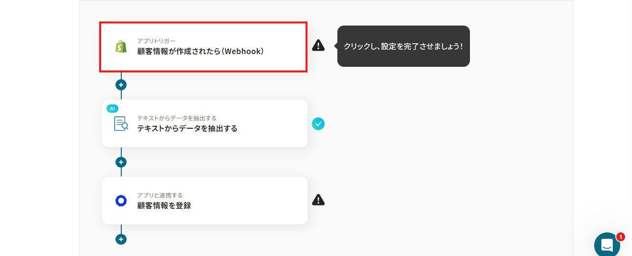 最初に、Shopifyアイコンの「顧客情報が作成されたら」という項目を押して設定します。