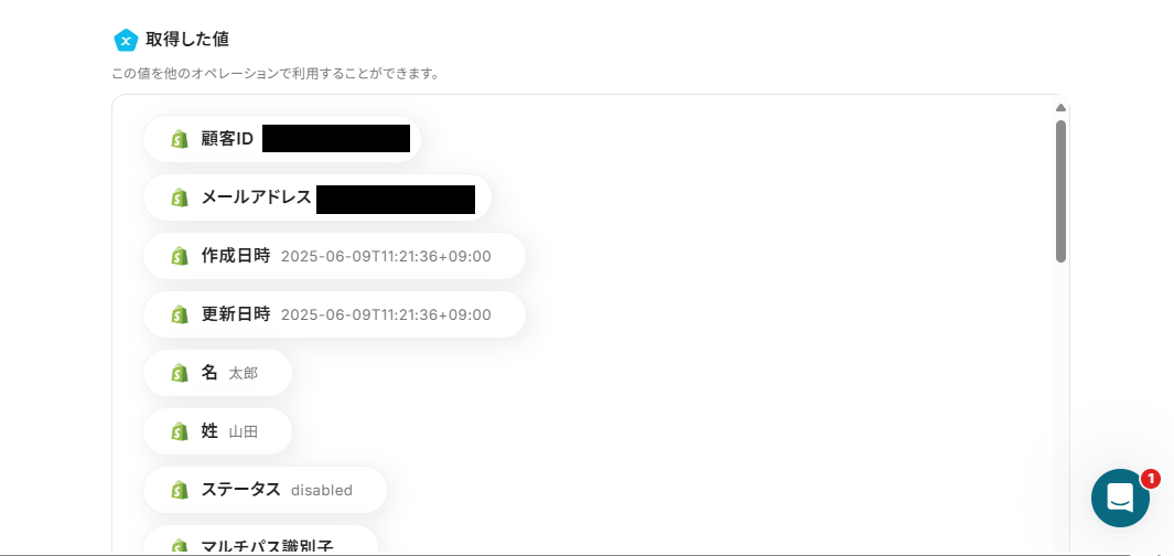 テストが成功すると先ほどShopifyに登録した顧客情報が取得した値(アウトプット)に表示されます。