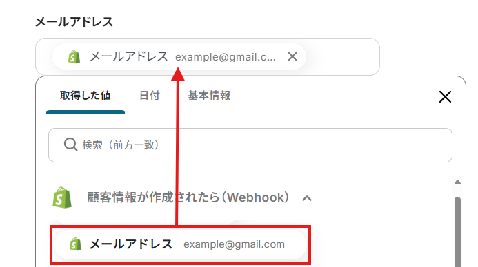 「メールアドレス」「電話番号」「名前」は、入力欄をクリックして表示される取得した値から選択してください。