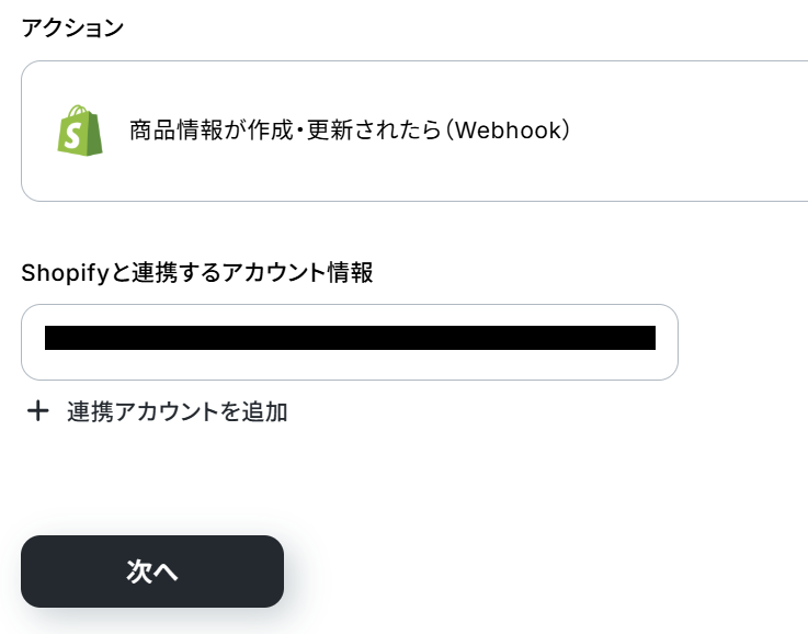 Shopifyと連携するアカウント情報が使用したいアカウントになっているか確認し、「次へ」ボタンをクリックしましょう。