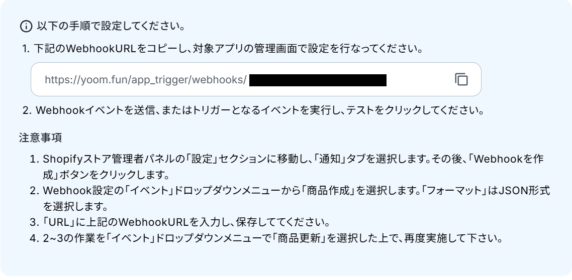 続いて、Webhookの設定を行います。 画面に表示されているWebhookURLをコピーし、Shopifyにログインしましょう。