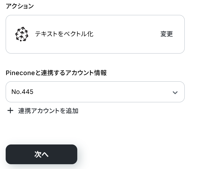 Pineconeと連携するアカウント情報を確認したら、次のページに進みましょう。