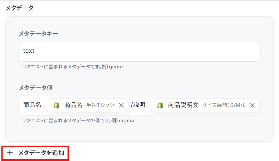 メタデータキーは、利用目的に合わせて適宜ご変更ください。 ※メタデータ値は、取得した値を活用し設定しましょう。 他にも追加したい項目がある場合は、「+メタデータを追加」をクリックして設定してください。