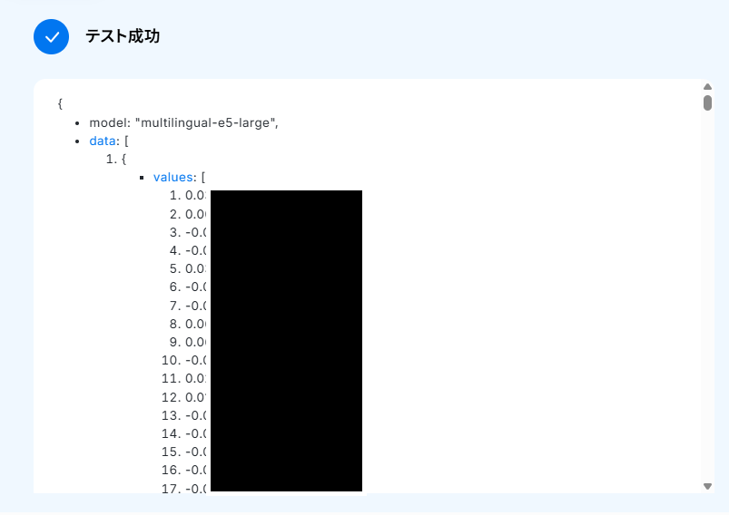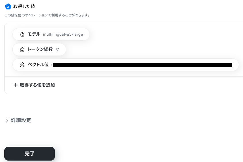 設定できたら、テストを実行してください。 テスト成功後、取得した値が表示されますので確認しましょう。 「完了」 ボタンを押したらステップ4の設定は完了です。