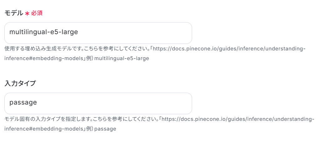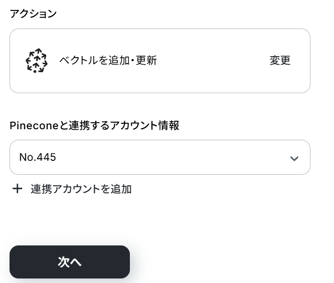 Pineconeの「テキストをベクトル化」アクションでは、ベクトル化の対象とするShopifyの商品情報(商品名、商品説明、タグなど)を任意で設定してください。 Pineconeでベクトルを追加・更新するアクションを設定する際に、対象となるインデックスホストを任意で設定してください。 ■注意事項