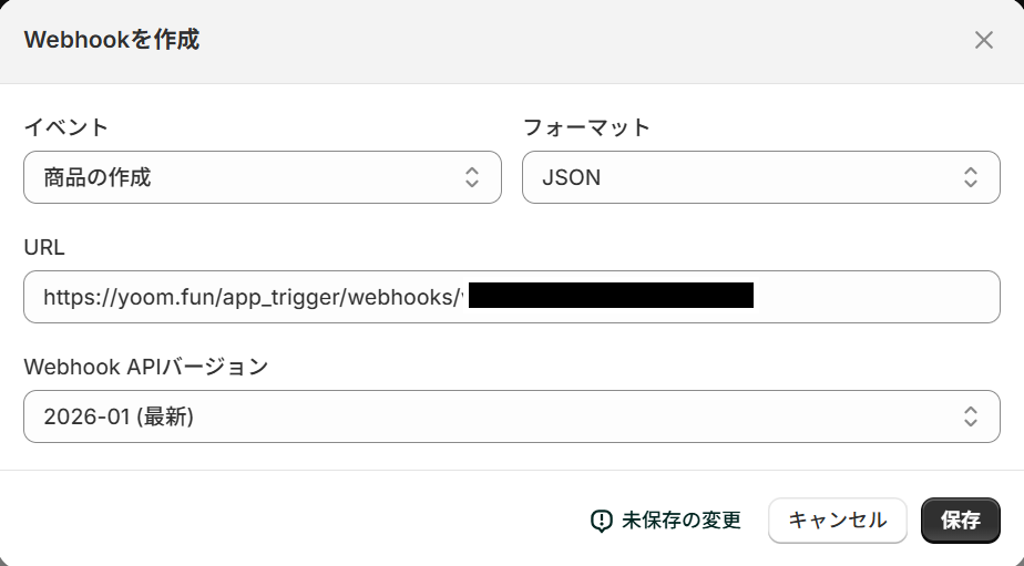 Webhookの作成画面が表示されるので設定します。 イベントは「注文の作成」を選択し、URL欄にYoomの画面でコピーしたWebhook URLをペーストしましょう。 入力できたら保存してください。