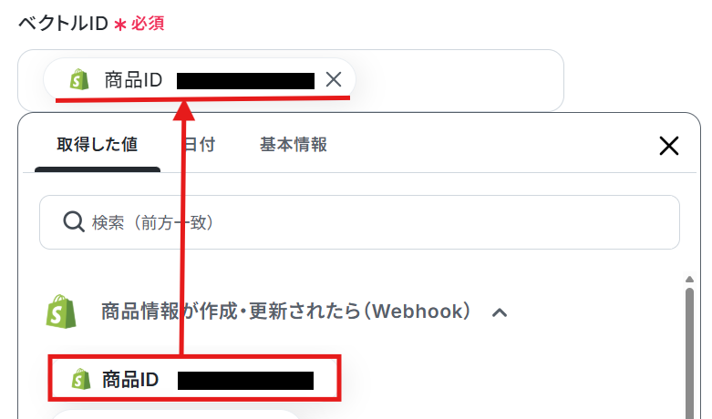 ベクトルIDは、Shopifyの商品IDが自動で取得できるように設定されています。 こちらの項目は変更可能です。用途に応じて任意の値に設定してください。