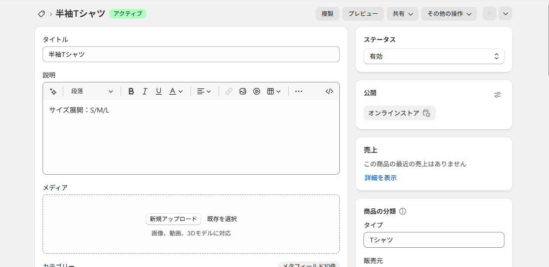 Webhookの設定が完了したら、トリガーが正しく動作するかテストを実施します。 テスト用の商品情報を作成してください。(架空の設定でOKです!)
